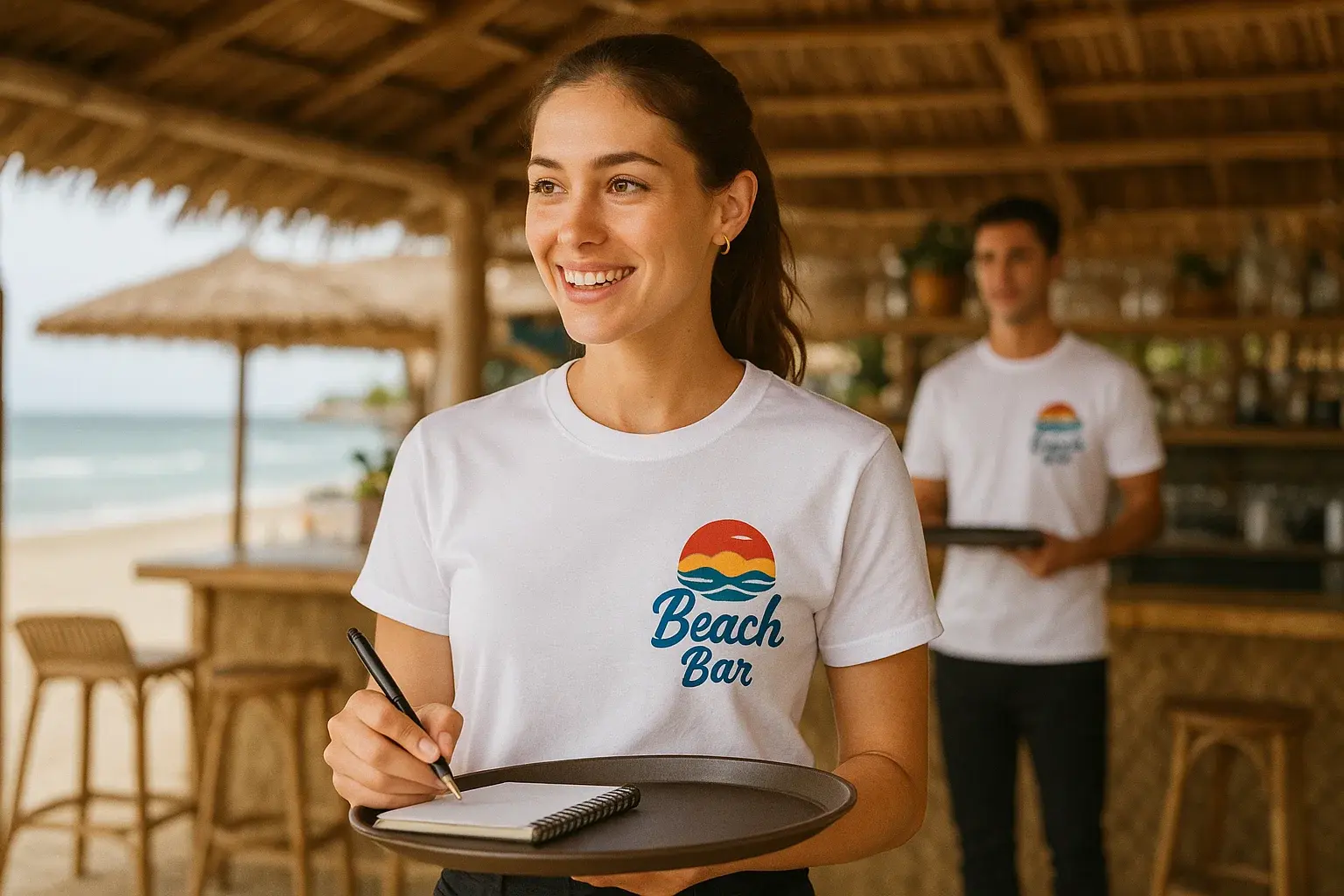 - Acabado menos integrado en el tejido: aunque el tacto es ligero, el diseño no se fusiona con la fibra como en DTG o sublimación.