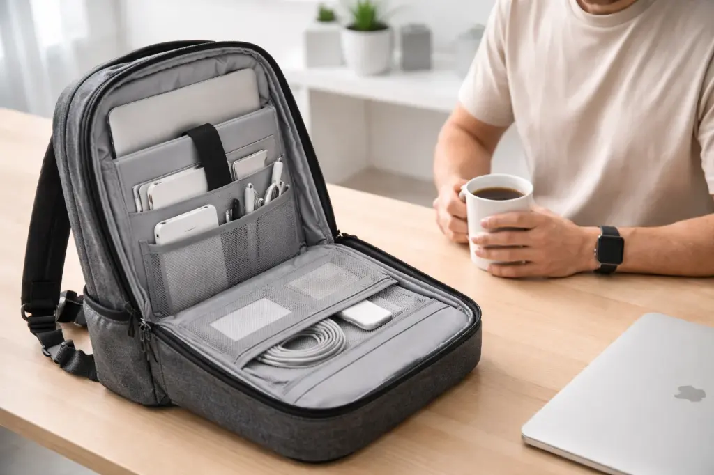 Si el equipo lleva portátil, cargador, botella y cuadernos, un modelo básico no sirve.